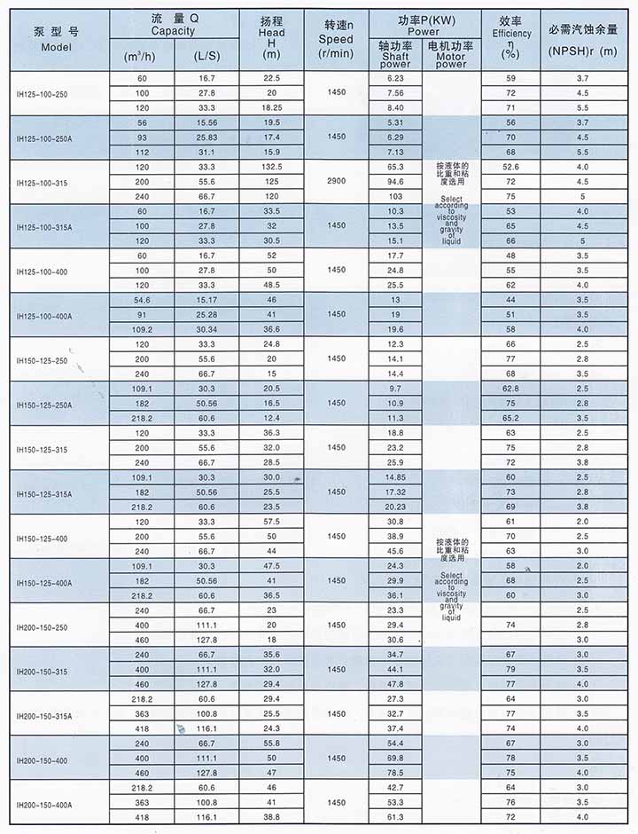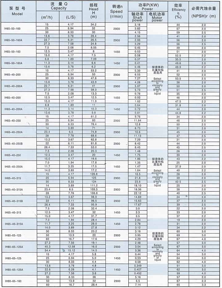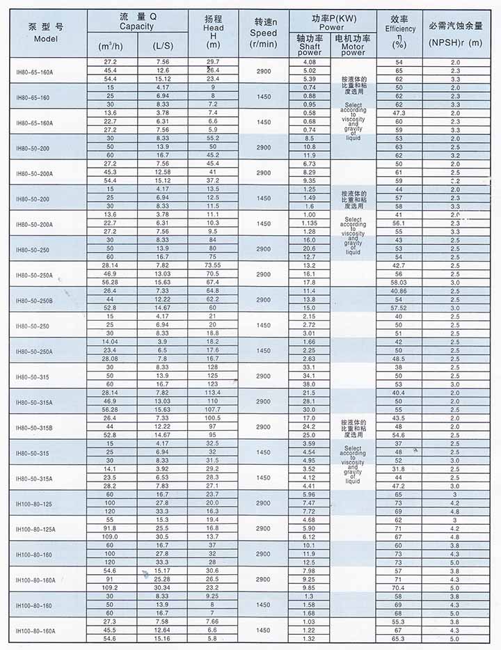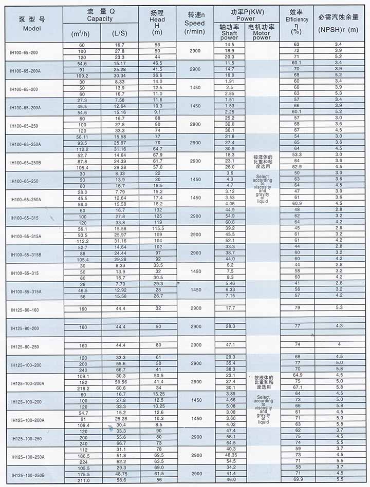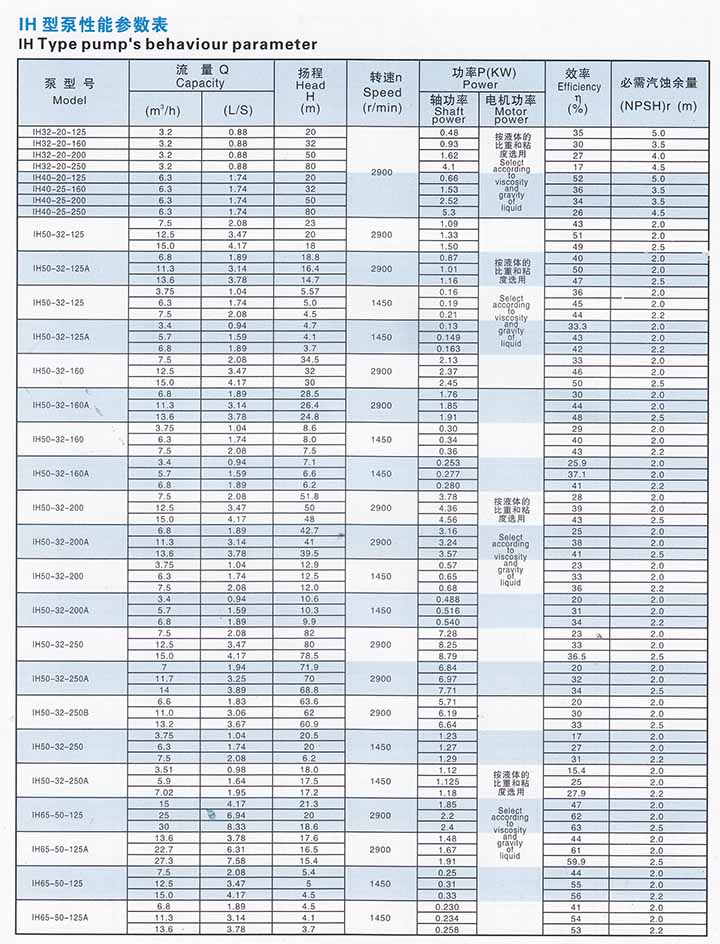 概述: IH型泵是單級單吸(軸向吸入)耐腐蝕離心泵,供輸送不含固體顆粒、具有腐蝕性、粘度類似水的液體。介質(zhì)溫度為-20℃~105℃,需要時(shí)采用冷卻措施溫度可更高。適用于石油、化工、冶金、電力、造紙、食品、制藥和合成纖維等部門。 性能范圍: 流量Q 0.3-400m3/h 配帶功率0.55-90kw 揚(yáng)程H 5-125mm 進(jìn)口直徑32-200mm 轉(zhuǎn)速n 2900、1450r/min 最高工作壓力1.6MPa IH型泵是全國泵行業(yè)采用ISO2858國際標(biāo)準(zhǔn)聯(lián)合設(shè)計(jì)的系列產(chǎn)品,具有性能范圍廣,效率高、“三化”水平高和維修方便等特點(diǎn)。 IH型系列泵有40個(gè)基本型,其中33個(gè)雙速(2900、1450r/min)經(jīng)過A、B兩種型式的葉輪直徑切割變型后,達(dá)112個(gè)規(guī)格。