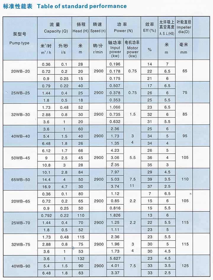 2、WB型旋渦泵共有十種型號:具體為20WB-20、25WB-25、32WB-30、40WB-40、WB-20、25WB-25、32WB-30、40WB-40、50WB-45、65WB-50、20WB-65、25WB-70、32WB-75、40WB-90。皆為單級懸臂式旋渦泵。